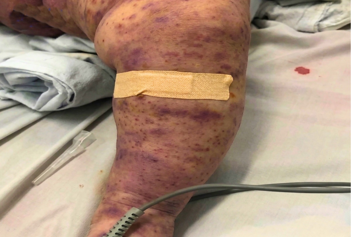 Khi bệnh tiến triển nặng, trẻ có thể xuất hiện các dấu hiệu nguy hiểm, điển hình là các ban màu tím sẫm trên da lan nhanh khắp cơ thể - Ảnh: VNVC