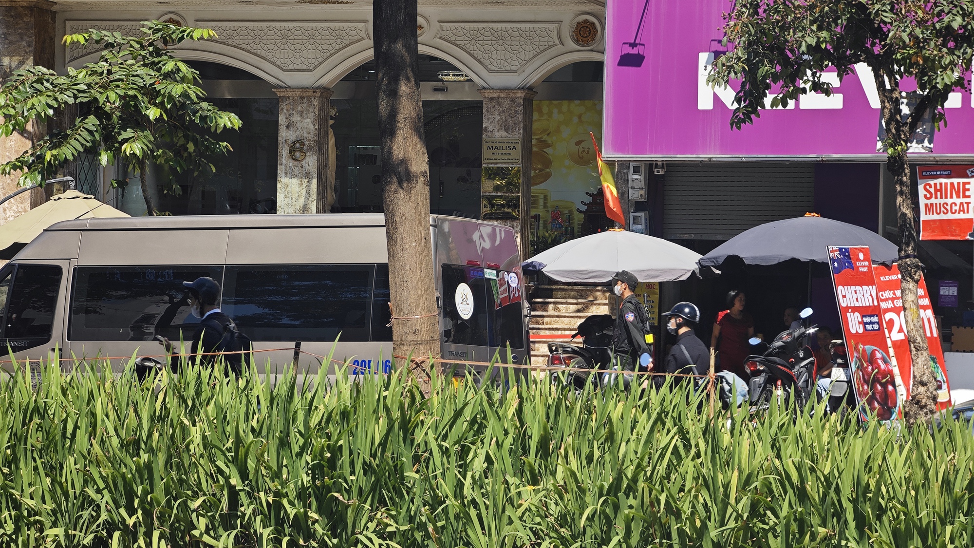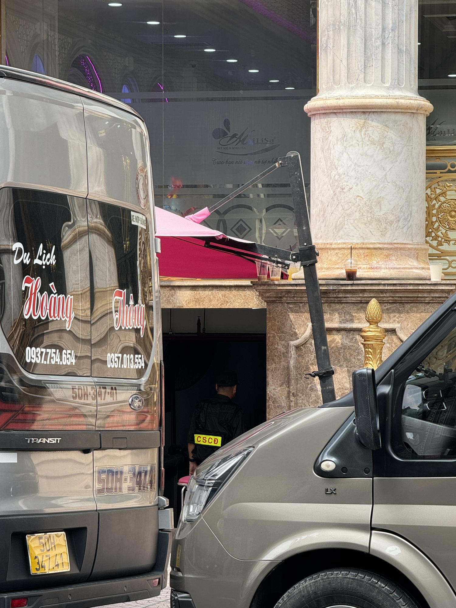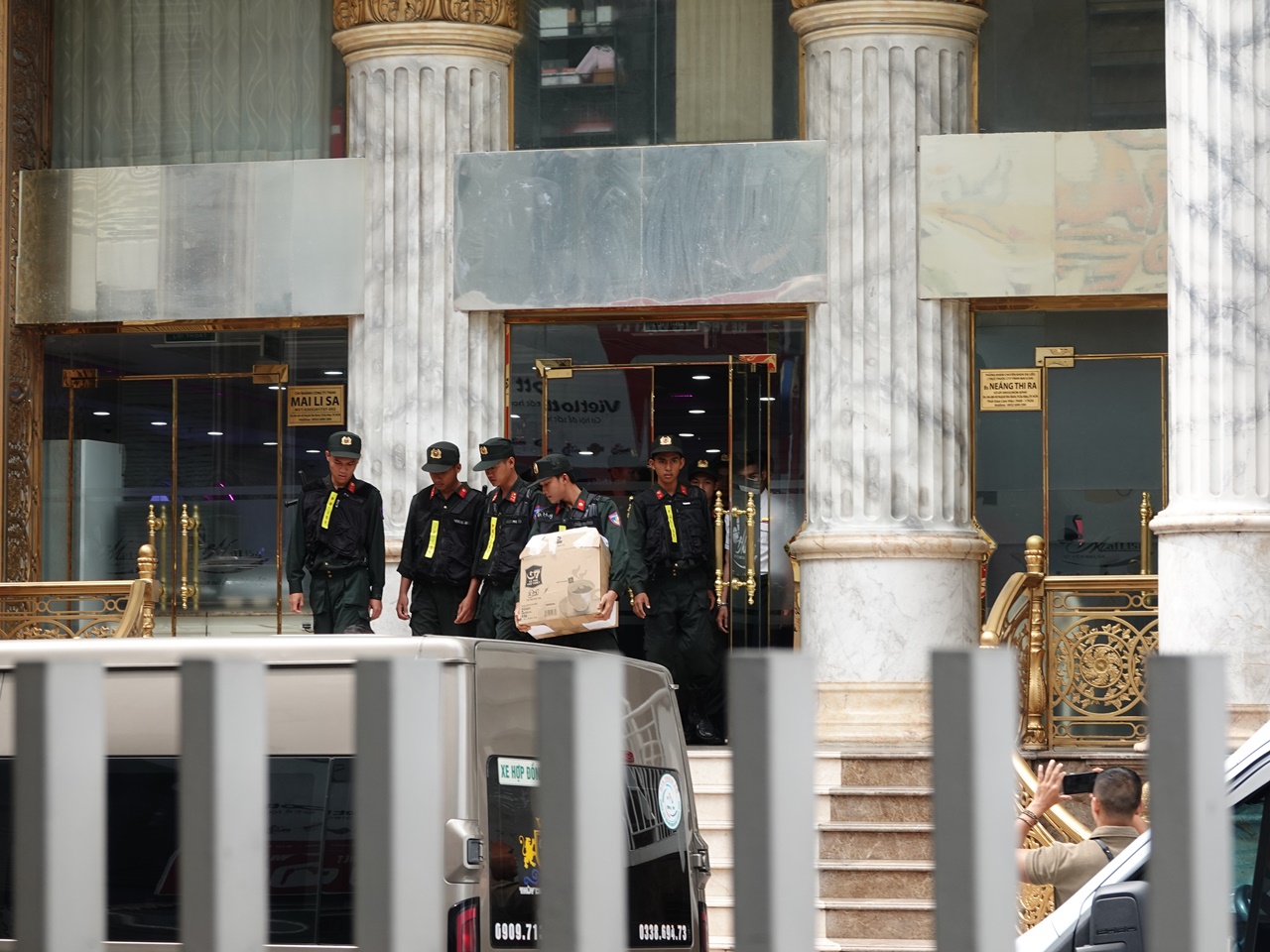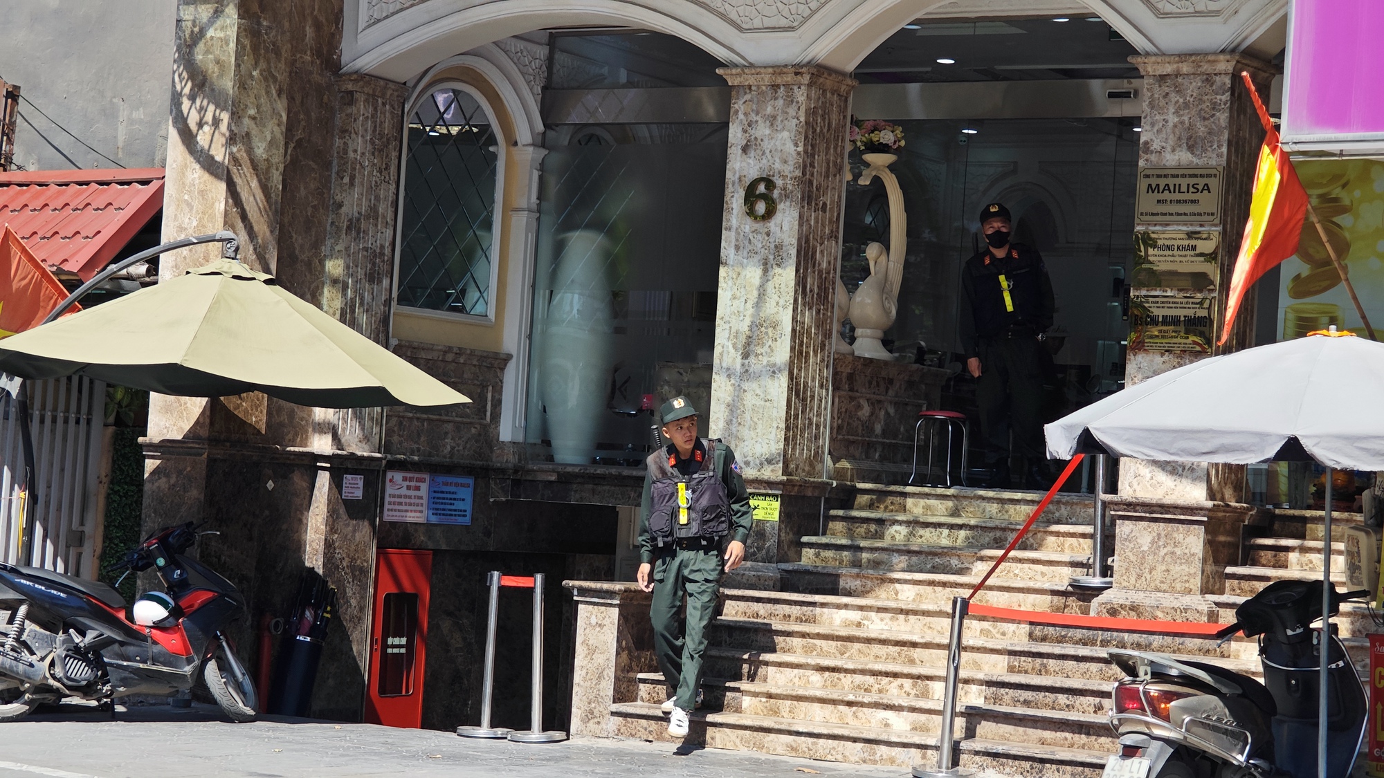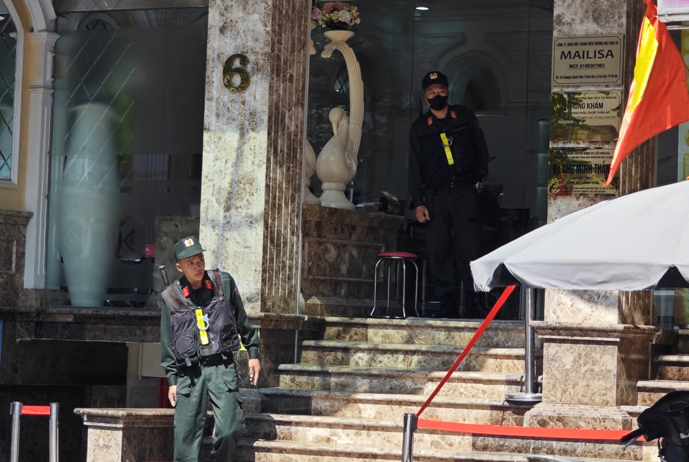 Phía trước trụ sở thẩm mỹ viện này xuất hiện ô tô biển số xanh, gắn còi ưu tiên và 2 chiến sĩ Cảnh sát Cơ động đứng bên ngoài. Bên trong trụ sở, lực lượng cảnh sát đang làm việc với một số người.