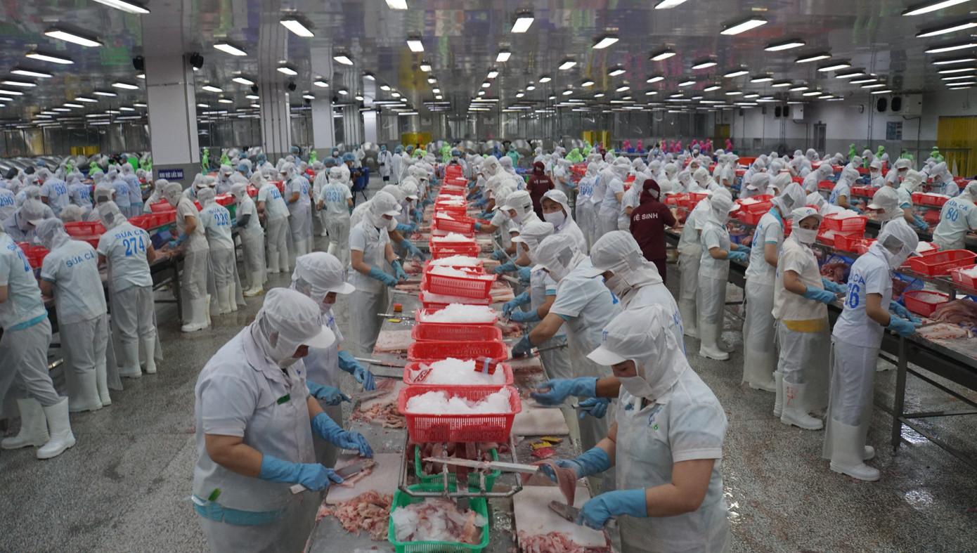 Công nhân chế biến cá tra tại Đồng Tháp. Ảnh: Hòa Hội.