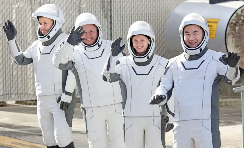 Phi hành đoàn Crew-11 bao gồm (từ trái sang phải) nhà du hành vũ trụ Roscosmos Oleg Platonov, các phi hành gia NASA Mike Fincke và Zena Cardman, và phi hành gia JAXA Kimiya Yui. Trong ảnh, phi hành đoàn chuẩn bị rời Florida vào ngày 1 tháng 8.