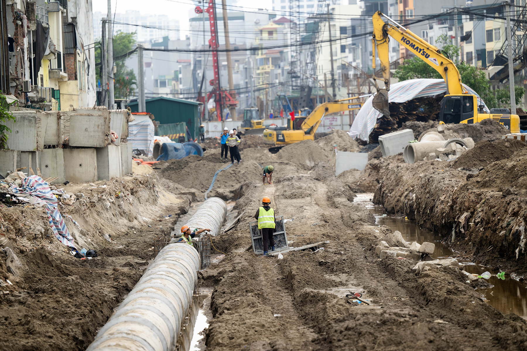 Hệ thống thoát nước tại dự án đường Vành đai 1 (đoạn Hoàng Cầu – Voi Phục) đang được xây dựng đồng bộ cùng nền đường, vỉa hè và hào kỹ thuật để đảm bảo chống ngập, tăng cường hạ tầng đô thị.