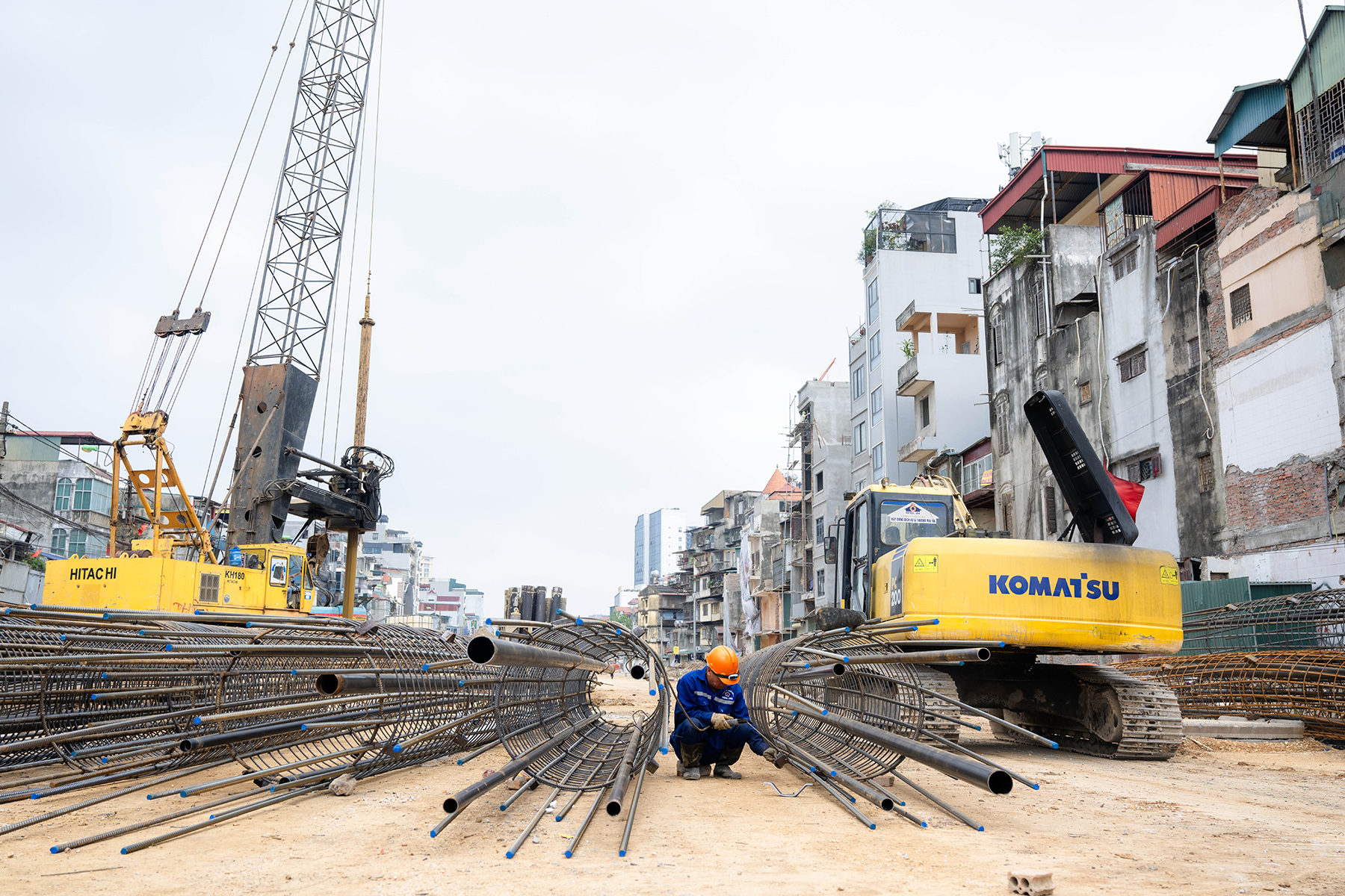 Trên công trường, máy móc, vật liệu, thiết bị xây dựng hoạt động liên tục, duy trì nhịp độ làm việc.
