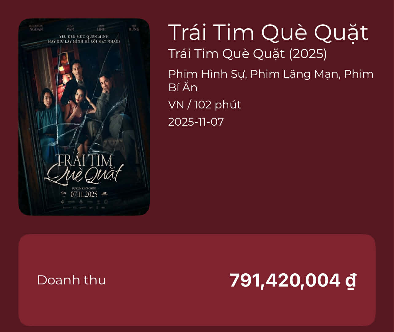 Dù nhận được đánh giá khá tốt từ giới chuyên môn bởi kịch bản mới lạ, diễn xuất chắc tay của dàn sao, “Trái tim què quặt” lại chỉ thu về 791 triệu đồng sau 2 tuần công chiếu. Trong 3 ngày cuối tuần vừa qua, doanh thu bộ phim này đạt mức 30 triệu đồng, tỷ lệ lấp đầy rạp chưa đến 5 vé/suất chiếu. Theo thống kê của Box Office Vietnam, tính đến 21h ngày 20/11, phim chỉ bán được 58 vé trên tổng số 40 suất chiếu trong ngày.