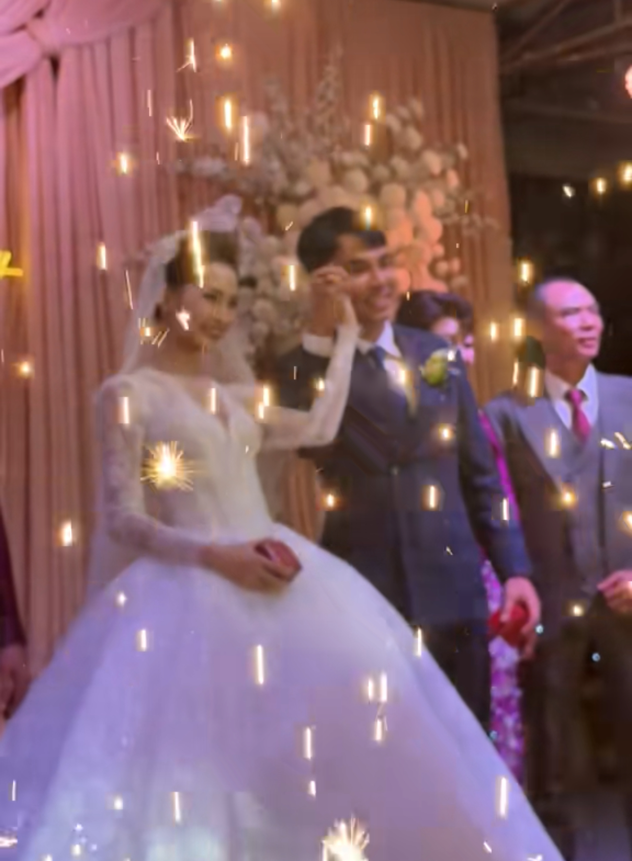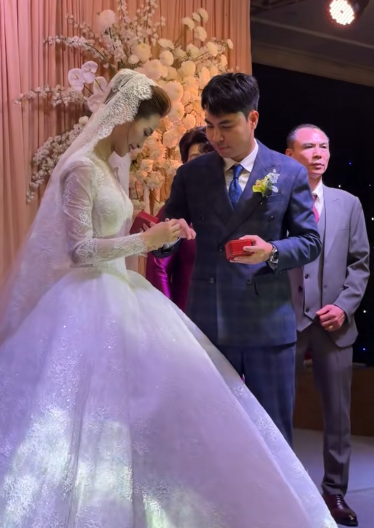 Trên sân khấu chính, cặp đôi đã cùng nhau thực hiện những nghi thức truyền thống như rót rượu tháp ly và cắt bánh cưới. Điểm nhấn xúc động nhất của buổi lễ là khoảnh khắc Đức Huy nhẹ nhàng đeo nhẫn cưới vào tay Huyền Trang. Dưới hiệu ứng pháo sáng rực rỡ, cặp đôi cùng nắm chặt tay giơ cao trong tiếng vỗ tay chúc phúc không ngớt từ phía dưới, đánh dấu cột mốc chính thức nên duyên vợ chồng.