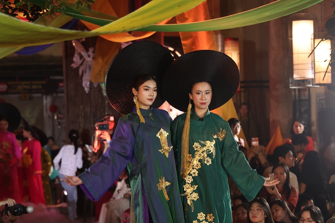 “Phố cổ là nơi tà áo dài Hà Nội từng hiện diện mỗi ngày, tôi muốn đưa nó trở lại đường phố, trở lại nhịp sống, chứ không chỉ lên sàn diễn”, NTK David Minh Đức (người ôm hoa) nói. Chính vì thế, BST lần này không chỉ là thời trang mà là di sản được “sống lại” ngay trong không gian bản địa.