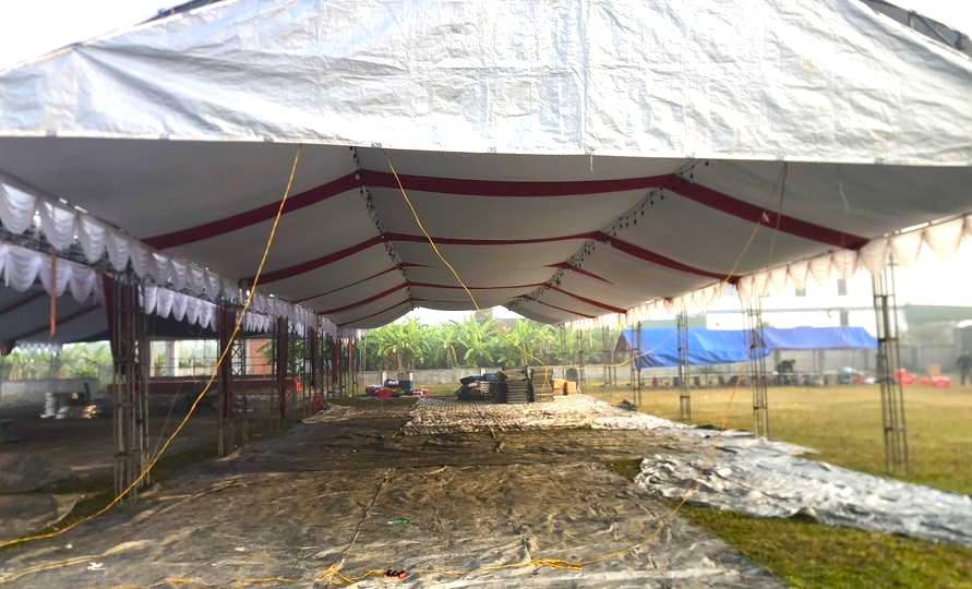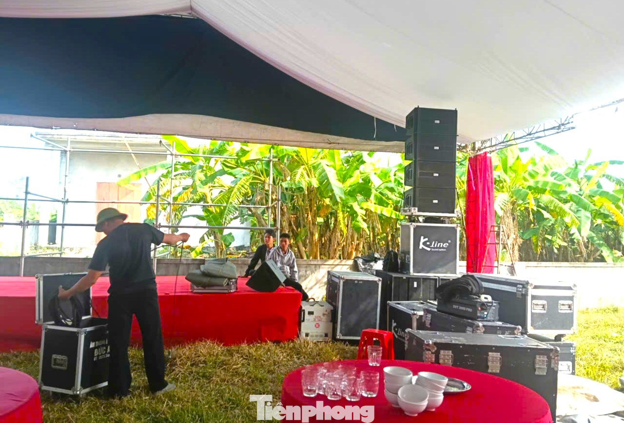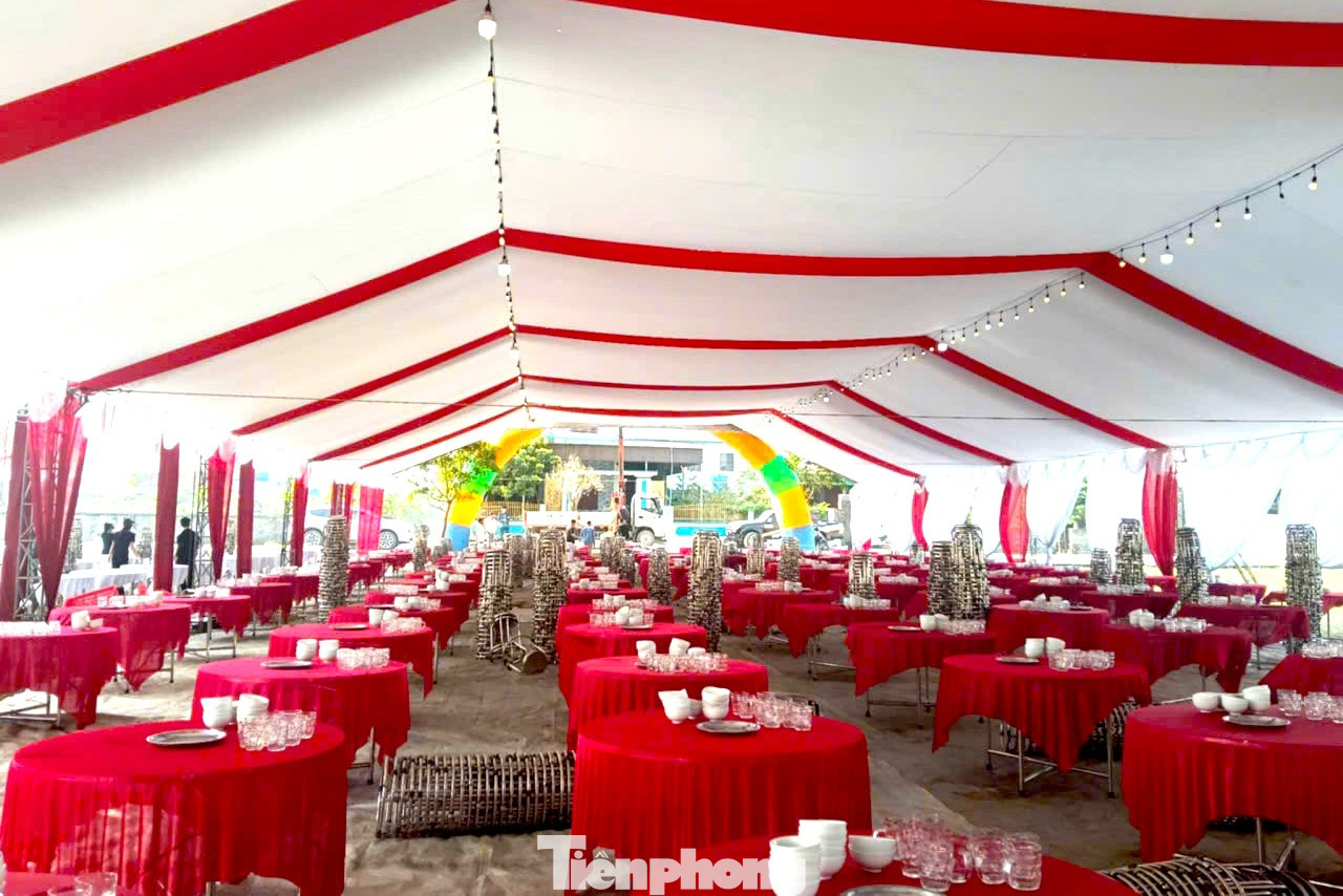 Từ sáng sớm 28/1, rạp được khẩn trương dựng tại sân vận động xóm Hưng Yên Bắc 2 để chuẩn bị 100 mâm cỗ.