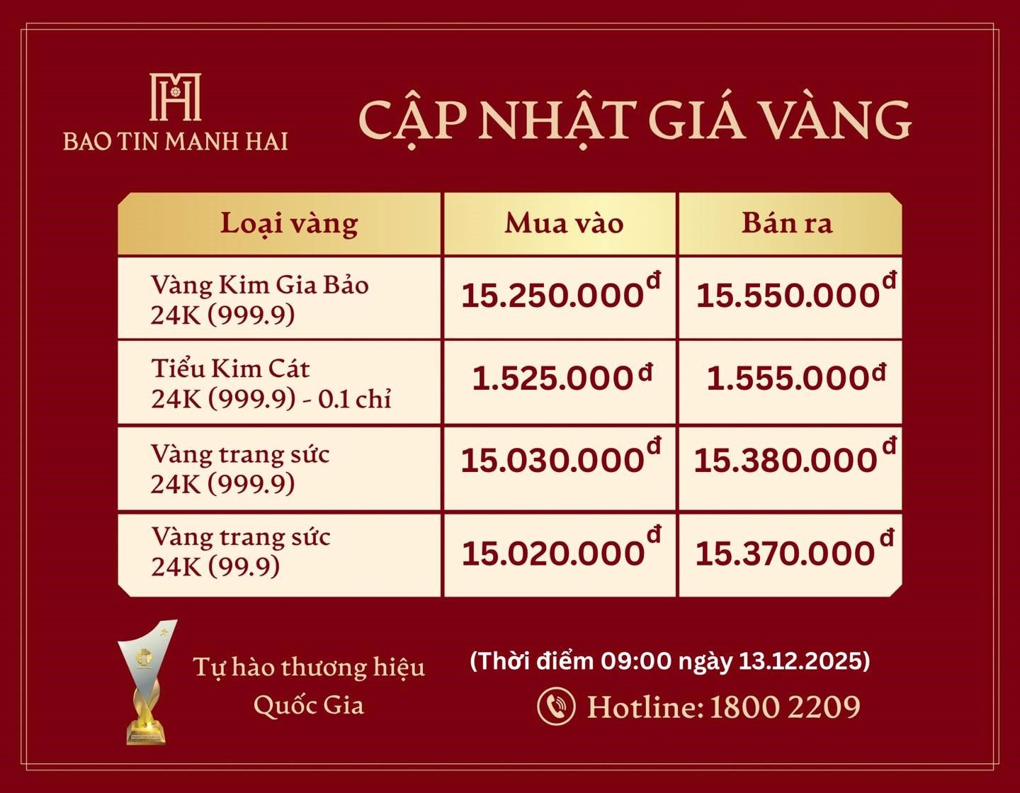 Trong khi đó, Bảo Tín Mạnh Hải niêm yết giá vàng Kim Gia Bảo và Tiểu Kim Cát mức mua vào là 15,25 triệu đồng/lượng và 15,55 triệu đồng/lượng chiều bán ra.