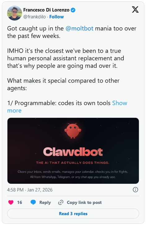 Sự hào hứng của giới công nghệ đến từ những ví dụ sử dụng rất thực tế. Bạn có thể cài Moltbot trên máy tính cá nhân và nó sẽ trở thành trợ lý ảo và làm các tác vụ trên máy tính thay cho bạn, dựa trên dữ liệu từ lịch làm việc, ứng dụng ghi chú và danh sách việc cần làm. Người khác lại để Moltbot tự động quản lý các tác vụ hành chính, gửi email, điền biểu mẫu trên trình duyệt hoặc giao tiếp với khách hàng. Với nhiều người, đây là hình ảnh rất gần của một “trợ lý số” đúng nghĩa, không chỉ trả lời mà còn thay họ xử lý công việc.