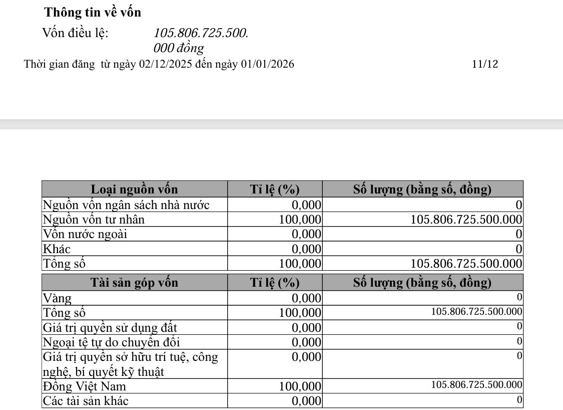 Trong tháng 12/2025, CTCP Nghiên cứu Đầu tư và Phát triển Tương lai tăng vốn điều lệ từ 105.807 tỷ đồng lên 114.507 tỷ đồng, tức là thêm 8.700 tỷ đồng, tương đương 8%. Vốn điều lệ mới gồm 42,4% là cổ phần phổ thông và 57,6% là cổ phần ưu đãi cổ tức.